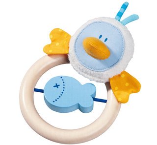 HABA 3756 - Paul Pingu rattles and his fish spins. The round wooden ring makes it easy for little fingers to grasp. He encourages clutching of objects and sensory perception. Measures 3.7" diameter. Made of maple and beech wood and velours. Paul can be removed for cleaning. Recommended for 6 months and up. Made in Germany.